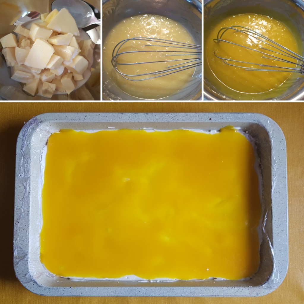 1. Rastopite kockice bele čokolade, komadiće putera i slatku pavlaku. Ako želite veći kontrast možete dodati malo žute prehrambene boje ( koristila sam gel), pa prelijte preko kolača.