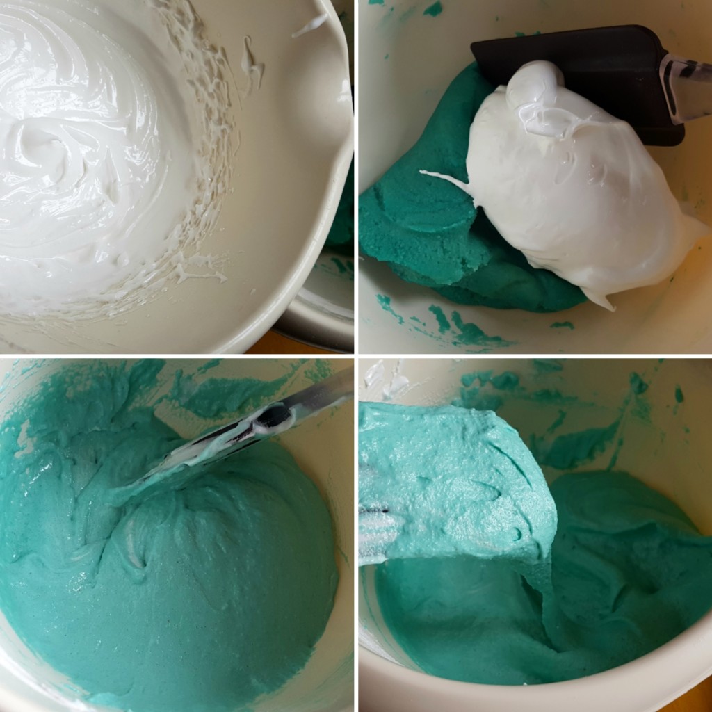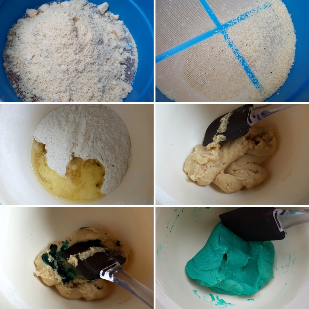 3. Pomešajte brašno sa prosejanim šećerom u prahu, pa dodajte 40 g belanaca i izmešajte špatulom u pastu. Dodajte gel boju i ponovo pomešajte da se sjedini. Treba dosta boje jer pečenjem posvetle.