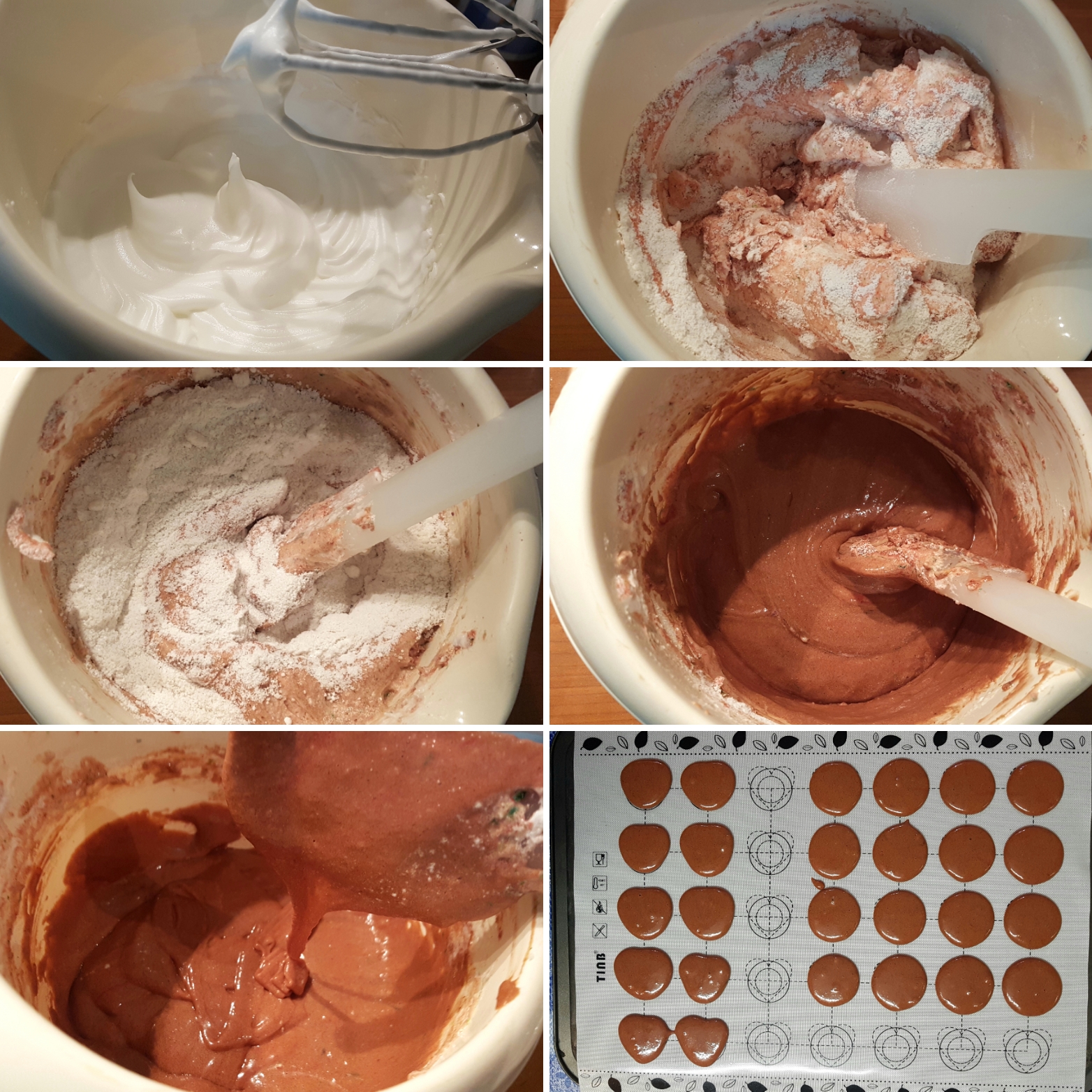 - Dodajte polovinu mešavine badema i šećera i špatulom sjedinite. A zatim umešajte i ostatak. Špatulom povlačite po dnu i zidovima posude istiskujući vazduh iz smese vršeći “makaronizaciju”. Postupak završite kad masa klizi sa podignute špatule u neprekidnom mlazu kao lava , al ne prebrzo.