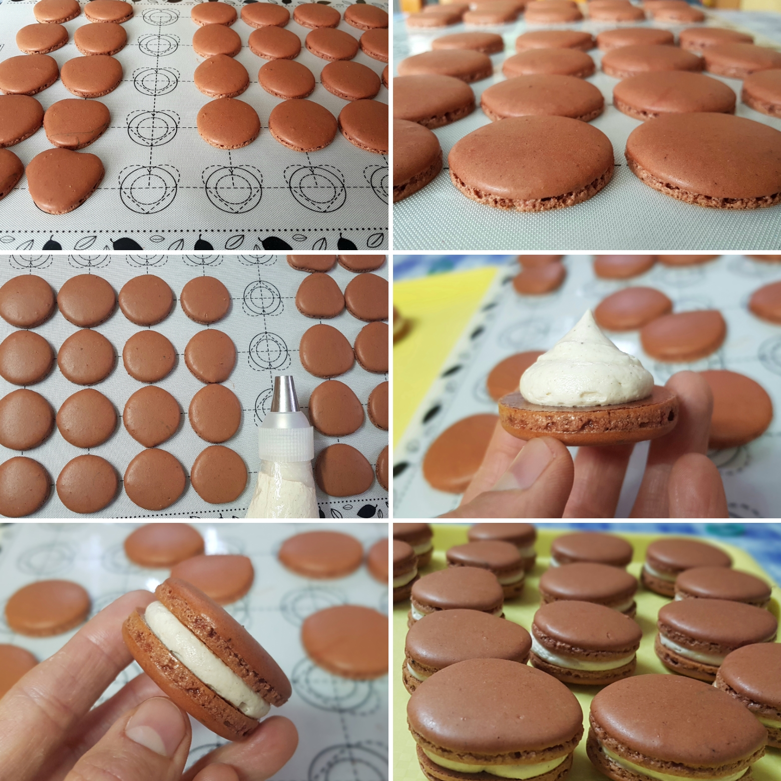 - Filom napunite poslastičarsku vreću i nastavkom okruglog otvora istisnite po malo krema na dno svakog drugog macaronsa, te spajajte po dva.