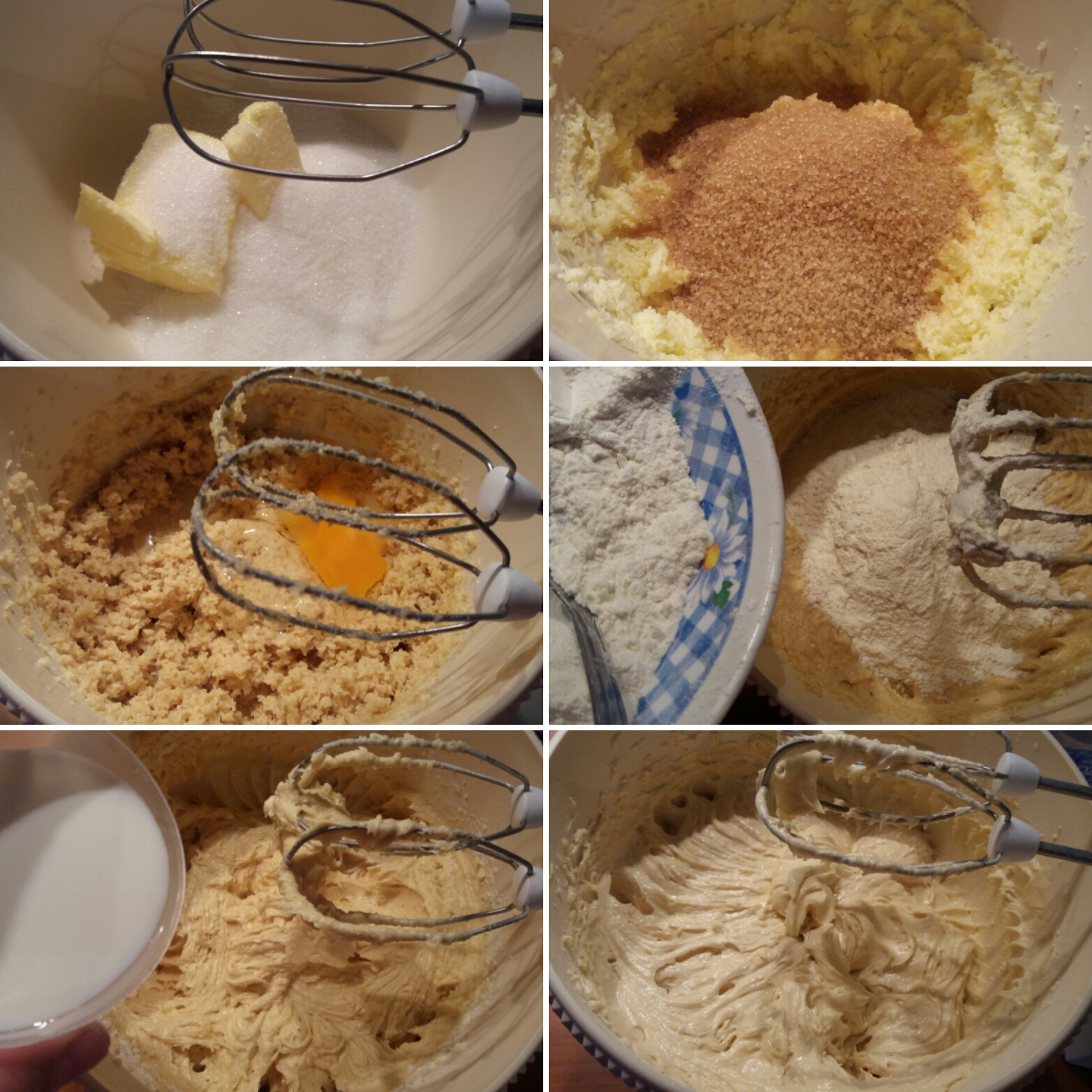 1. Umutite puter sa šećerom, dodajte par kapi arome vanile i braon šećer, te još malo miksajte. Potom dodajte jedno pa drugo jaje, a između opet mutite da se masa ujednači. Na kraju naizmenično dodajte brašno pomešano sa praškom za pecivo i mleko sve vreme muteći.