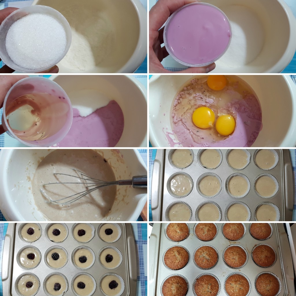 Recept za mafine koji se brzo pripremaju, a sočni su i lagani nađoh na mađarskom sajtu Mindmegette , pa ga prevedenog i isprobanog delim vama. Pravila sam ih sa jogurtom od šumskog voća, te sam u svaki bila dodala po kupinu i meni se tako dopalo, dok se mojoj deci više svidelo bez njih. Obzirom da vi najbolje znate svoj i ukus svojih najmilijih recept izmenite kako vam najviše godi.