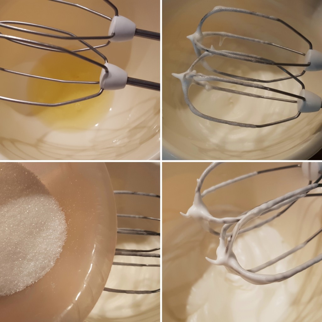 2. Odstojala belanca ulupajte u šam sa prstohvatom soli. Dodajte šećer i miksajte dok se ne rastvori. Kad završite na mutilicama trebaju ostati tzv. “tvrdi vrhovi”.