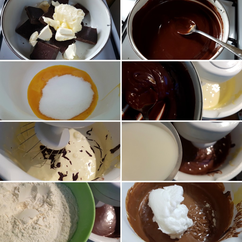 - Umutite žumanca sa šećerom. Dodajte čokoladu i puter i sve lepo izmiksajte, a zatim naizmenično sipajte brašno pomešano sa praškom za pecivo i mleko neprekidno muteći.