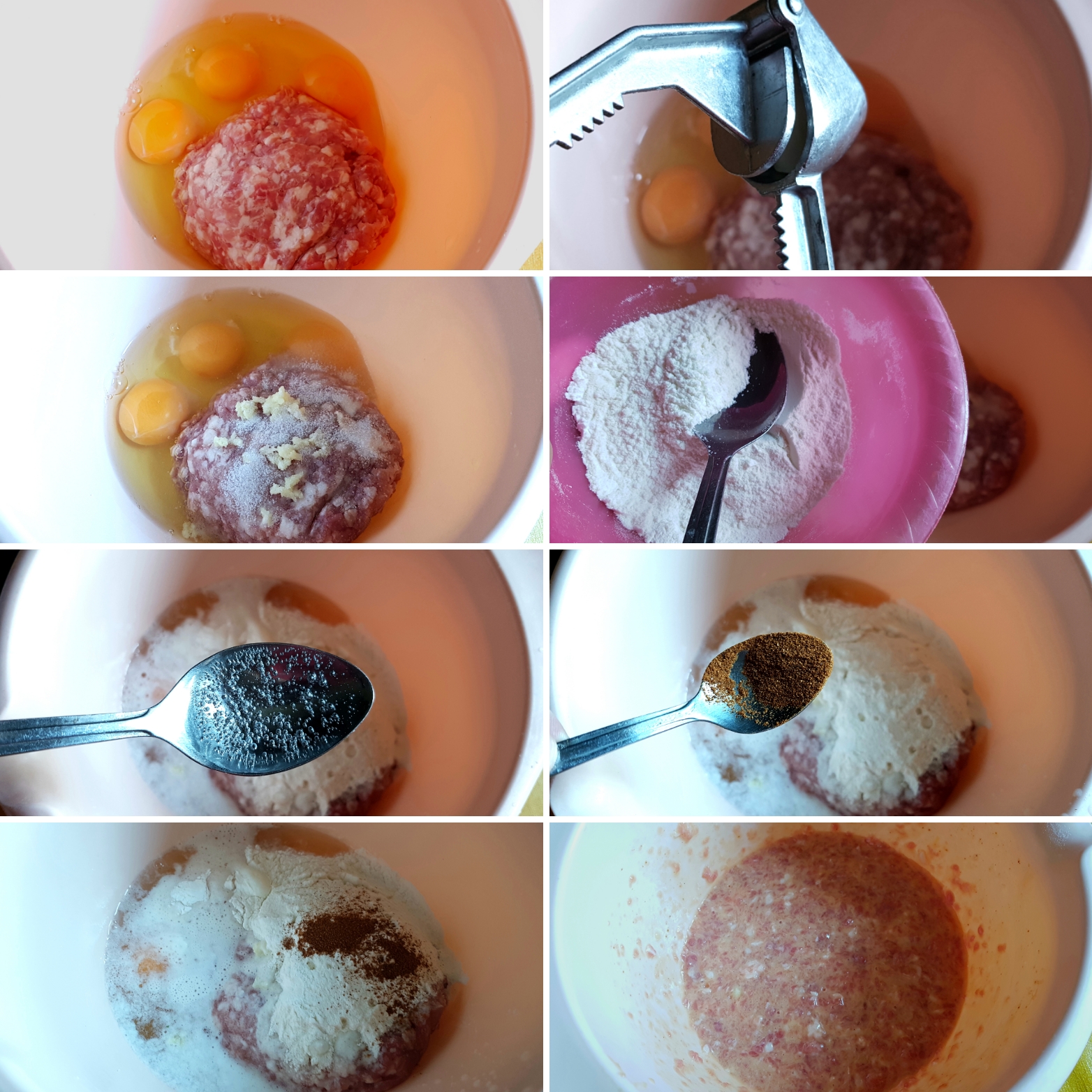 1. U odgovarajuću činiju stavite mleveno meso, pa dodajte prethodno viljuškom razmućena jaja, brašno pomešano sa praškom za pecivo, kiselu vodu, izgnječen beli luk, so, alevu papriku i biber po ukusu.
