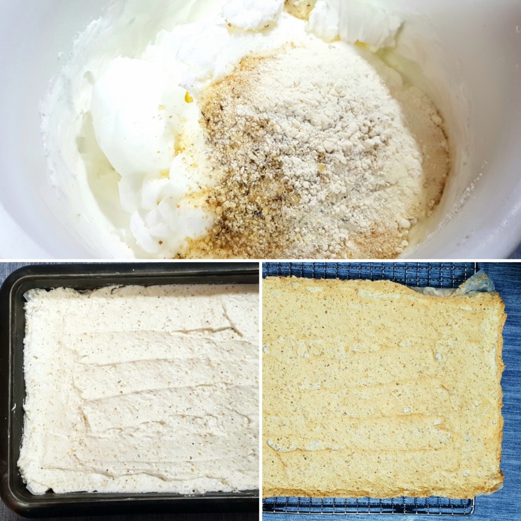 2. Pripremljenu smesu rasporedite u papirom za pečenje postavljen pravougaoni pleh (moj je bio 22×32 cm) i pecite u rerni zagrejanoj na 180 °C 15-18 minuta.