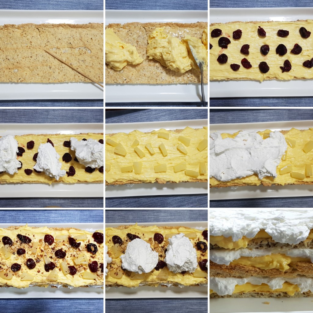3. Pekrijte drugom korom. Nju premažite trećinom žutog krema, rasporedite 2/3 ananasa, seckane lešnike i trećinu šlaga sa pavlakom.