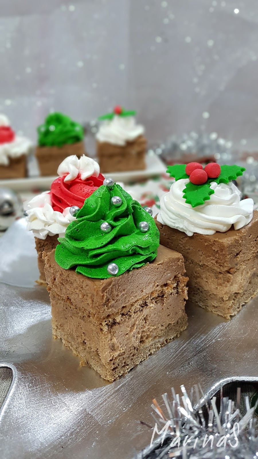 3. Kolač možete premazati umućenim šlagom , a možete ga i prvo iseći na kocke pa svaku ponaosob ukrasiti tufnom šlaga il kao ja ovog puta obojiti prehrambenim bojama i dekorisati u prazničnom stilu.