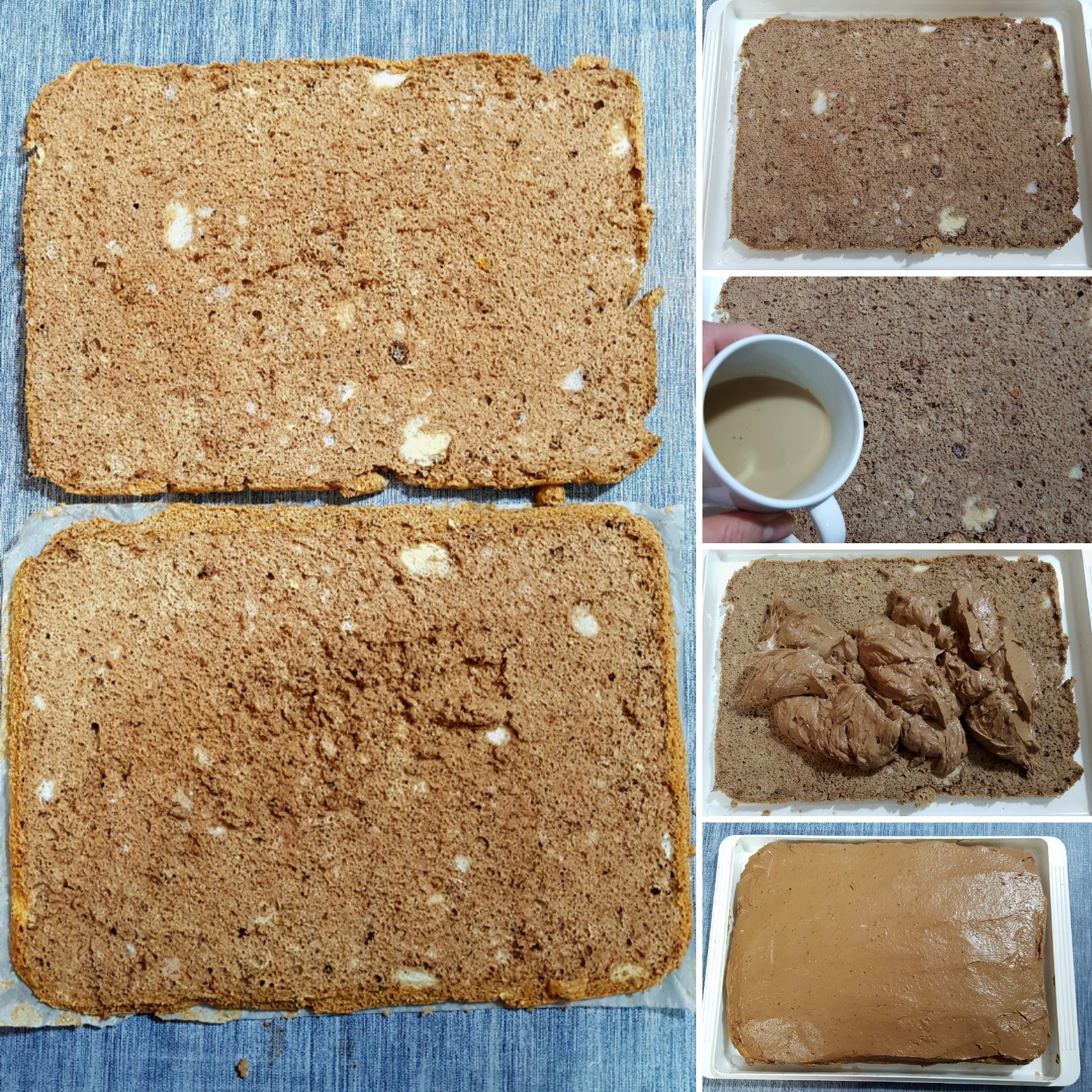2. Donju koru poprskajte polovinom kafe , premažite polovinom krema, te prekrijte drugom korom. Ostatkom kafe je poškropite , nanesite preostali fil , poravnajte i ostavite da se rashladi.