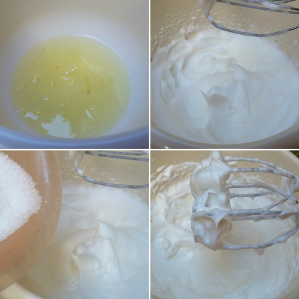 4. Ulupajte belanca sa prstohvatom soli u šam sa “mekim vrhovima”, a potom dodajte šećer iz dva puta i miksajte do “tvrdih vrhova”.