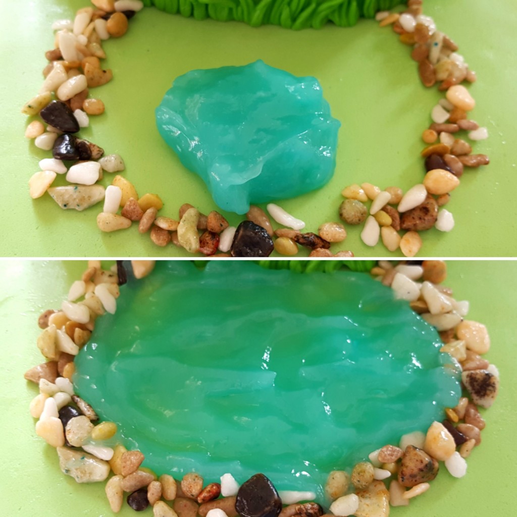 NAPOMENA: Ako želite baš ravnu površinu ne čekajte da se ohladi nego ga sipajte dok je još topao i u tečnom stanju (ne vreo) i sipajte u mlazu. Imitaciju kapljica rose pravite takođe dok je u tom agregatnom stanju.