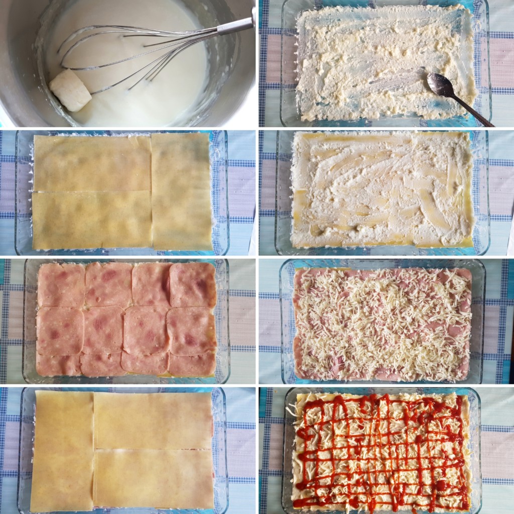 2. Poređajte salamu, pospite rendanim trapistom i prošarajte kečapom od gore. Prekrijte još jednim slojem kora, a potom  postupak filovanja ponavlajte dok ne potrošite sav materijal. Slaganje završite slojem kora koje ste  premazali bešamelom, posuli trapistom i išarali kečapom izostavivši salamu.