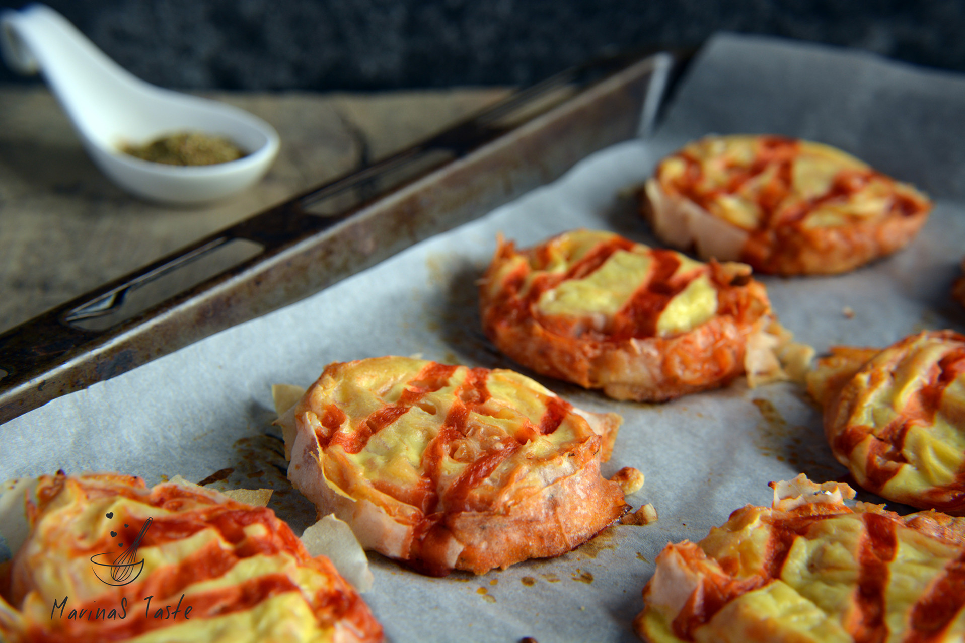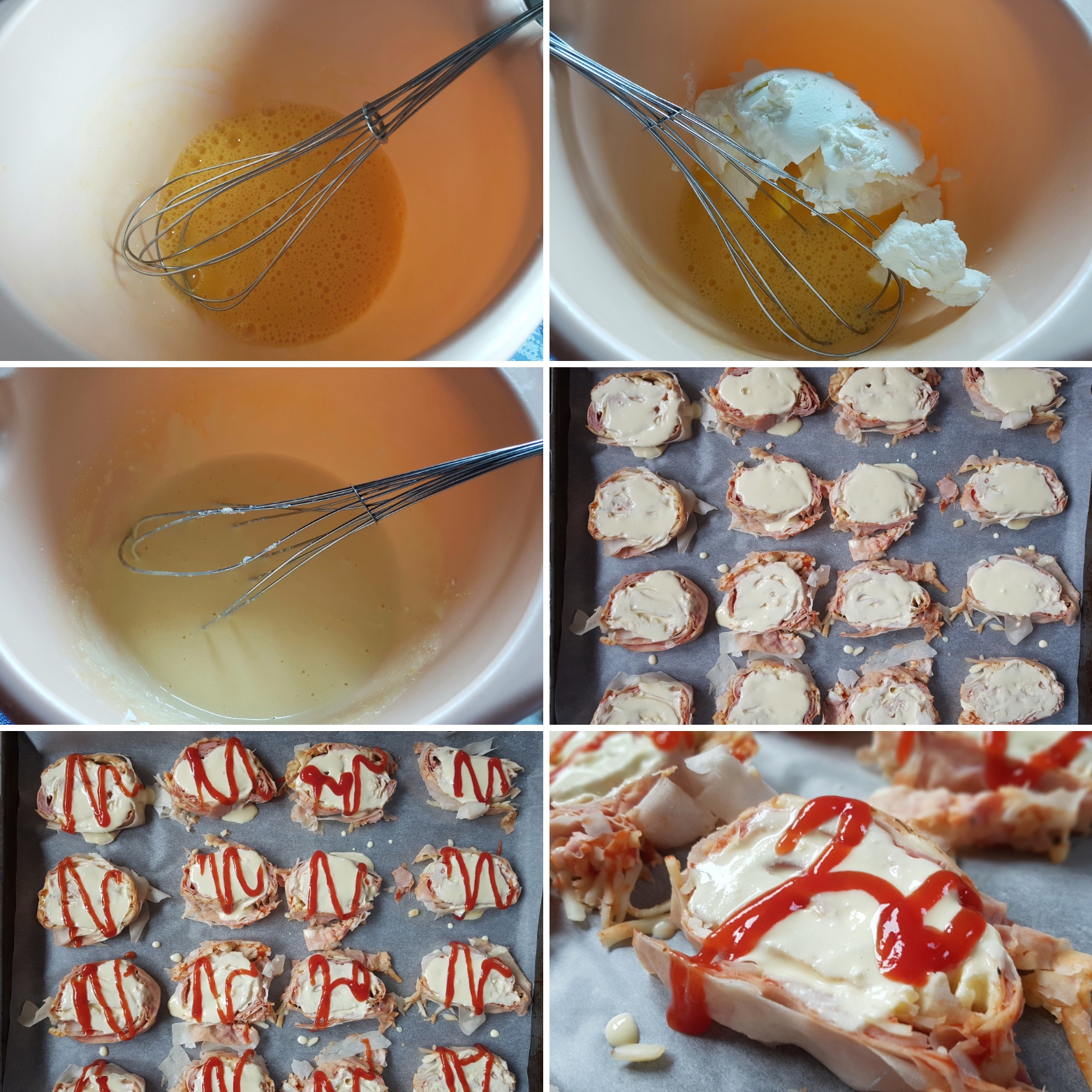 9. Razmutite jaja sa malo soli, dodajte sir, te žicom izmešajte da se sve sjedini. Po jednu kašiku smese stavite na svaki kolutić, a na kraju kečapom prošarajte.