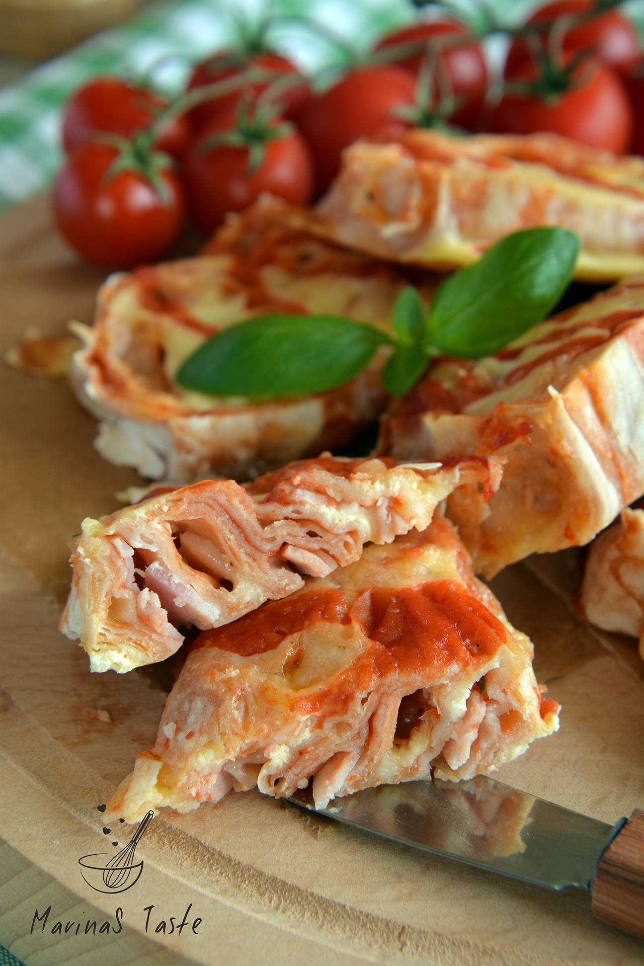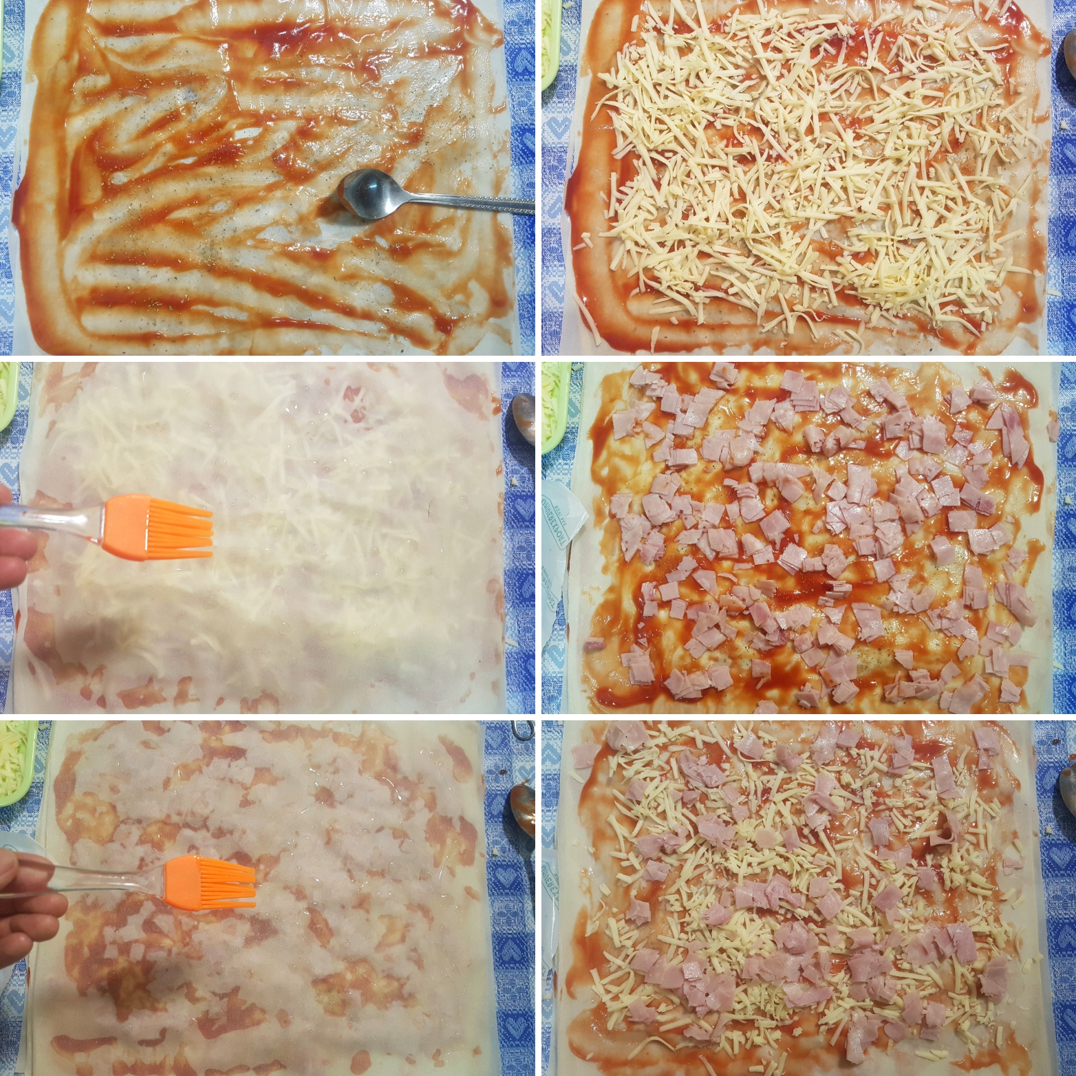 5. Preklopite 5. korom, ponovite postupak prskanja uljem, pa stavite šestu i nju prskajte uljem, premažite kečapom, pospite origanom i od gore poređajte preostale trećine trapista i šunke.