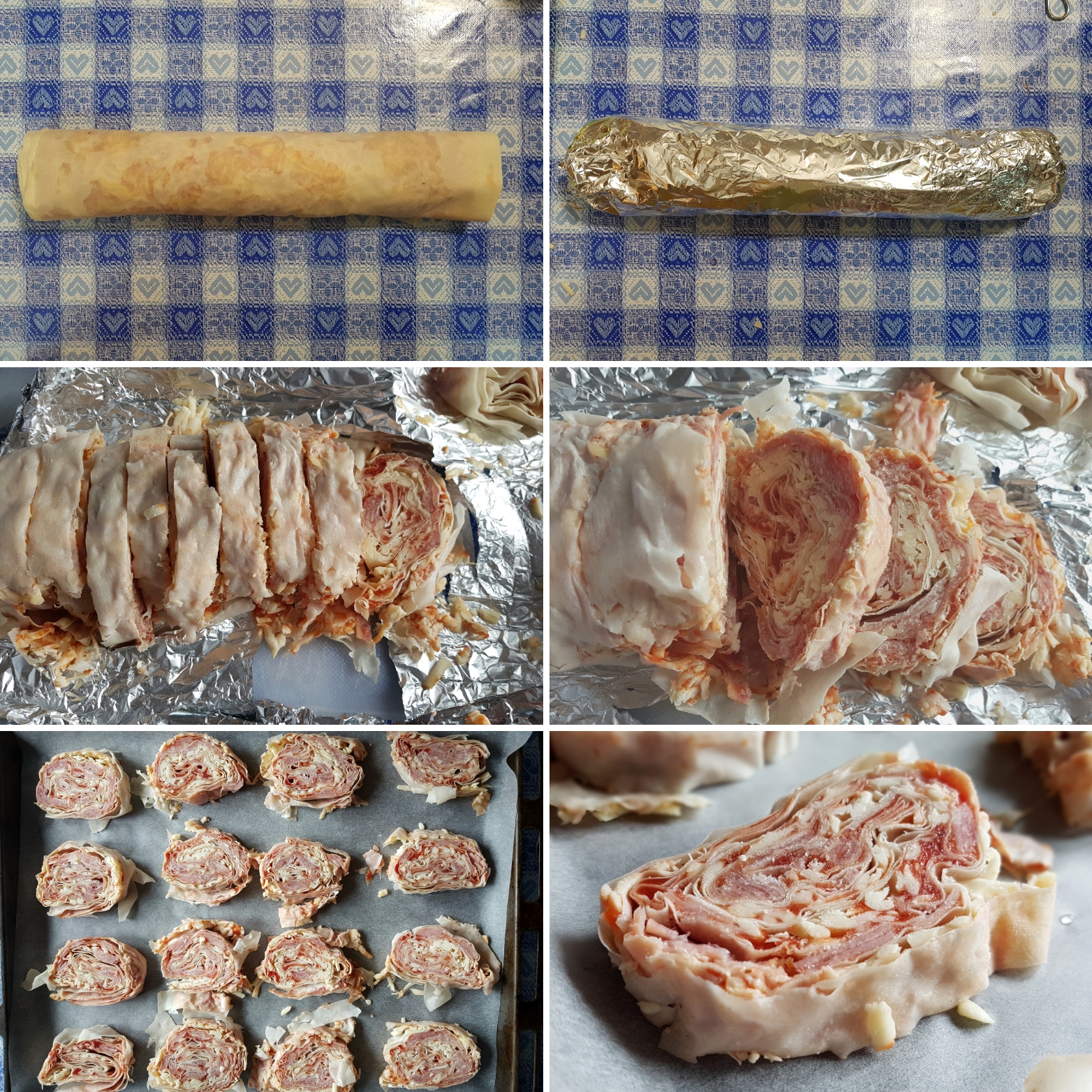 8. Rolat poprečno isecite na šnite debljine od 1.5cm, pa ih ređajte položene na papirom za pečenje postavljen pleh.