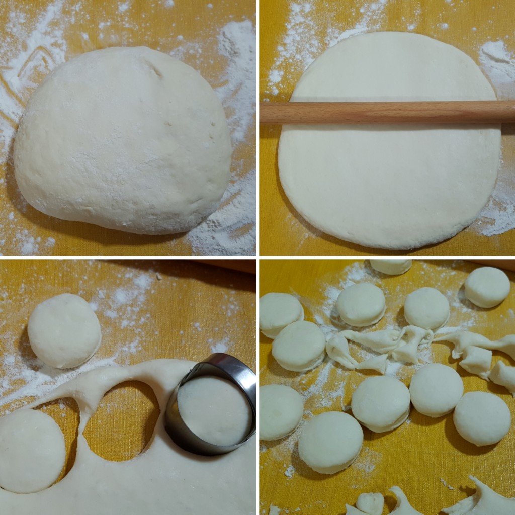 3. Oklagijom rastanjite naraslo testo na debljinu od 1 cm ,pa modlom vadite krugove i ređajte ih na papirom za pečenje postavljen pleh.