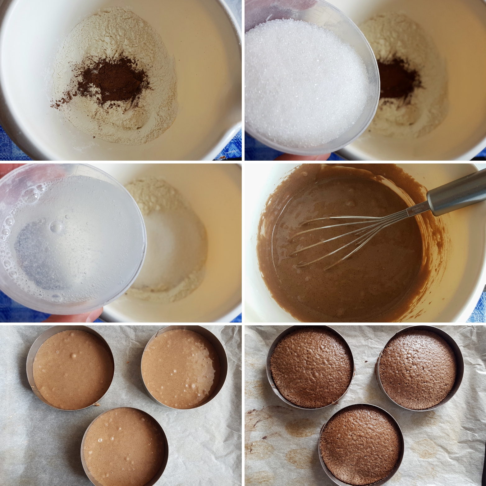 - U odgovarajućoj posudi pomešajte brašno sa sodom bikarbonom i kakaoom. Dodajte šećer i kiselu vodu, pa žicom sve lepo izmešajte da se spoji u homogenu smesu.