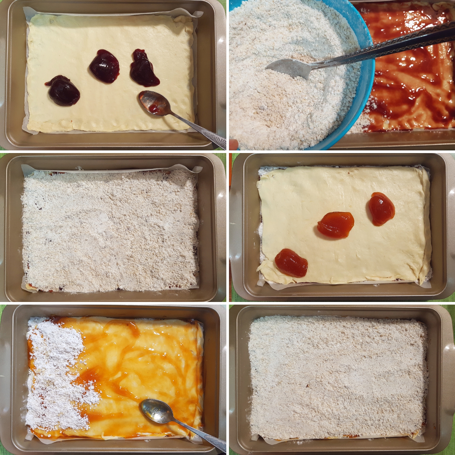 4. Drugi deo testa takođe razvijte u pravougaonik i položite preko, te premažite džemom od kajsija i pospite preostalom mešavinom oraha i šećera.