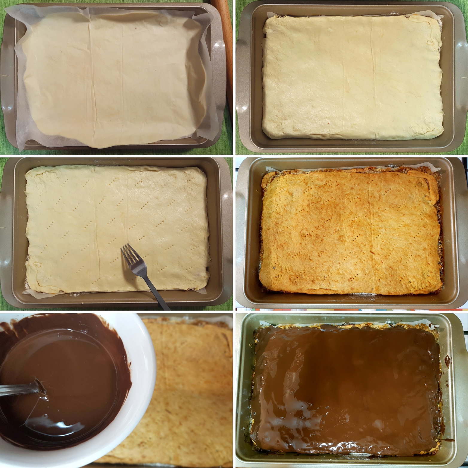 5. Na kraju sve prekrijte trećim razvaljanim pravougaonim komadom testa, izbockajte viljuškom, pa pecite u rerni zagrejanoj na 200 °C dok ne porumeni.