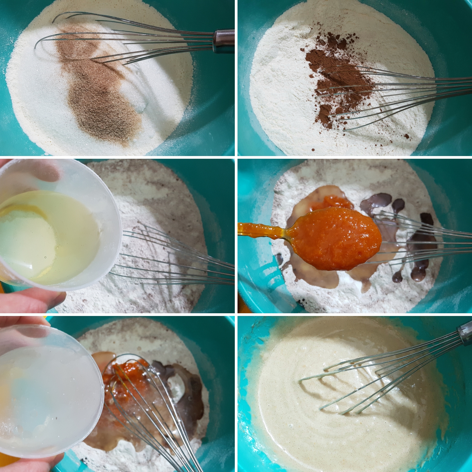 1. U posudu sipajte brašno i pomešajte ga sa praškom za pecivo, sodom bikarbonom, kakaom i cimetom. Dodajte potom šećer, vanilin šećer, ulje, džem od kajsija i vodu, te izmešajte dobro žicom/mutilicom da se sve lepo sjedini u homogenu masu.