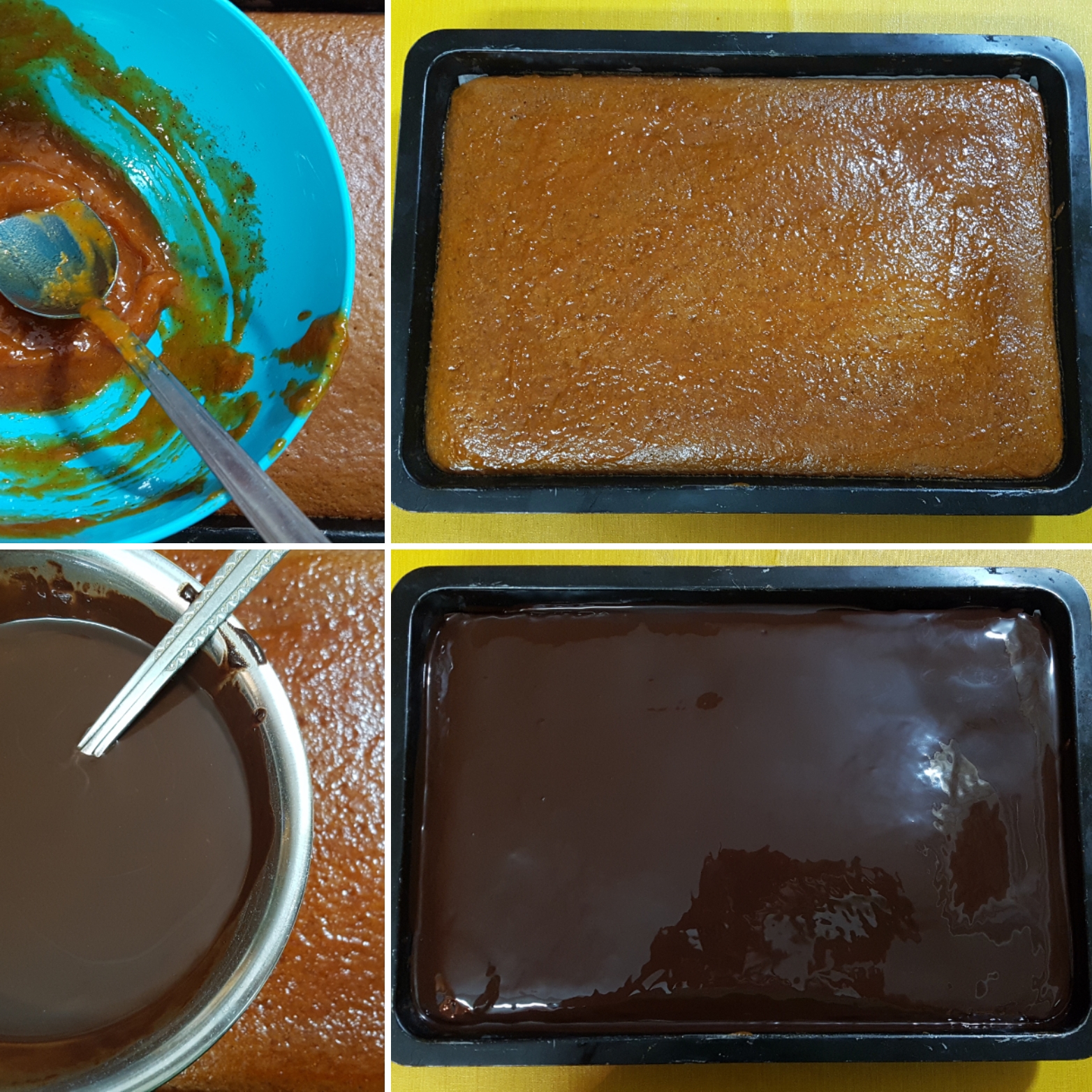 6. U sudu nad parom rastopite čokoladu sa uljem i prelijte preko. Kad se glazura stegne oštrim nožem isecite parčad željene veličine.