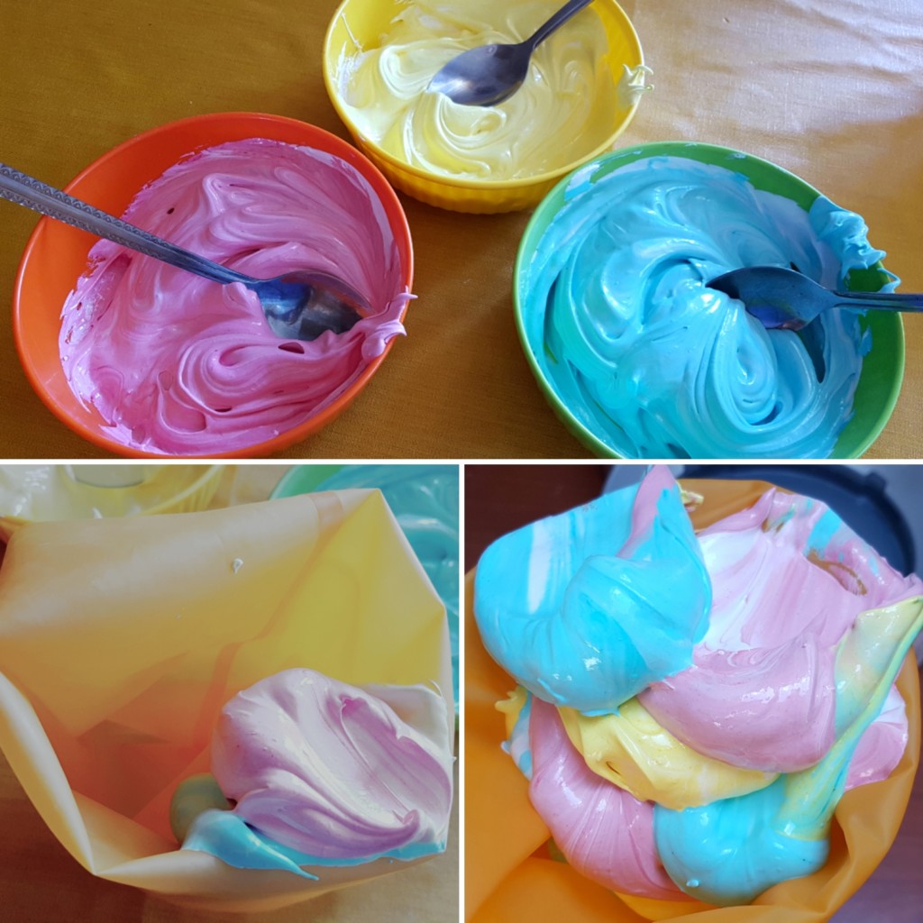 4. Pripremljeni šam podelite na onoliko delova koliko različitih boja planirate da upotrebite, pa u svaki deo umešajte po malo željene boje.