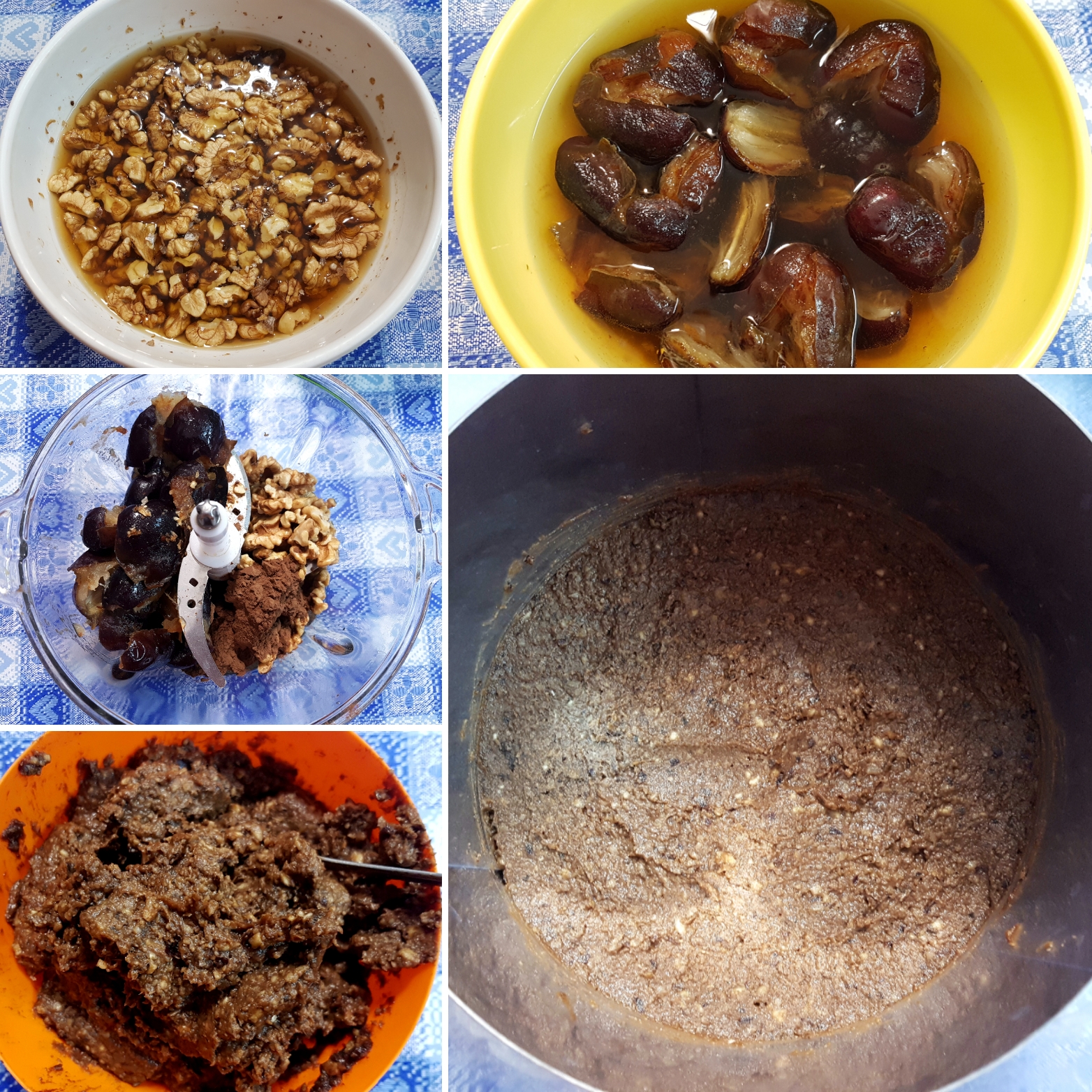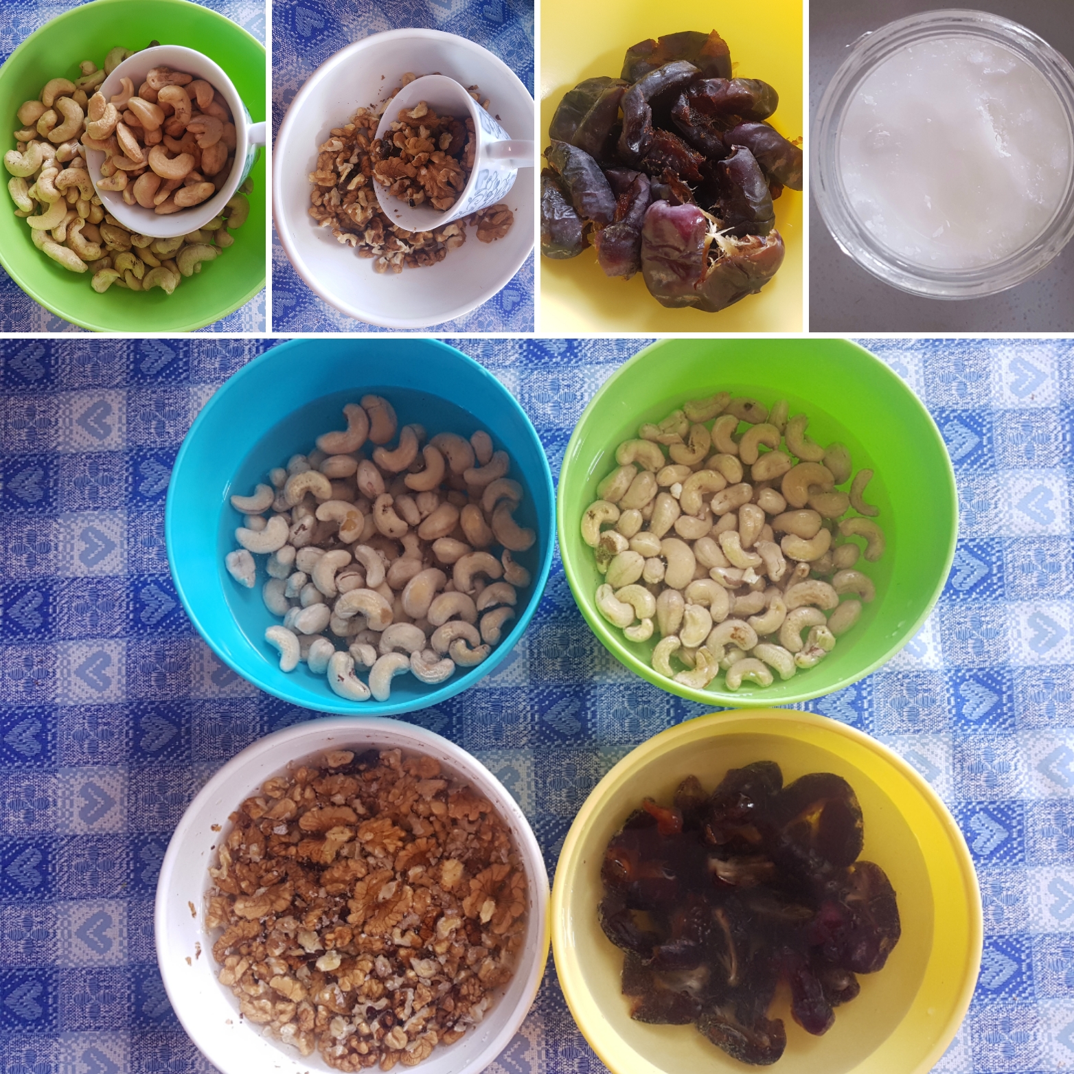 - Bar nekoliko sati ranije a možete i prethodno veče odmerite indijski orah u dve činijice, a posebno orah ( il semenke suncokreta) i otkoštene urme, te sve prelijte vodom. Ostavite da se dobro namoči, pa višak vode ocedite.