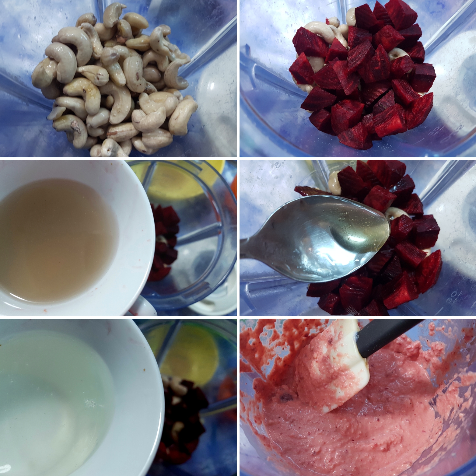 - U baš dobari jak blender stavite oceđen indijski orah, iseckanu cveklu, med, rastopljeno kokosovo ulje i malo vode, pa miksajte pulsno (s prekidima) uz dodavanje vode po potrebi. Skidajte špatulom deliće smese i vraćajte u sredinu.