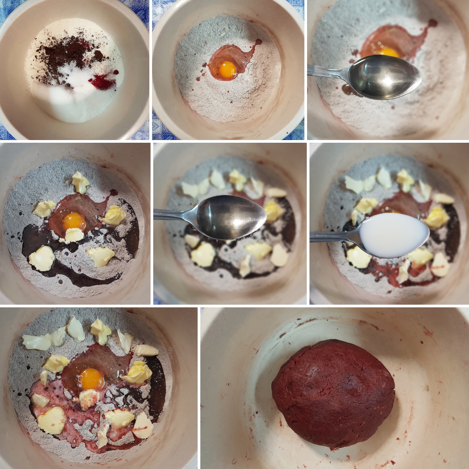 Dakle, po receptu za ovakav krem tart testo za kore se mesi kao pri izradi keksa, oblici se isecaju i peku, te će nekima više odgovarati za rad. Radi lepšeg utiska i asocijacije na čuvenu Red Velvet tortu dodaje se crvena prehrambena boja, ali nije obavezna. Ako je izostavite dobićete braon korice, koje će i dalje tvoriti divan kontrast sa belom kremom. Recept za testo sam našla na nemačkom sajtu Vanille Tanz, a kremu sam sama ishemijala, verovali ili ne. 🙂
