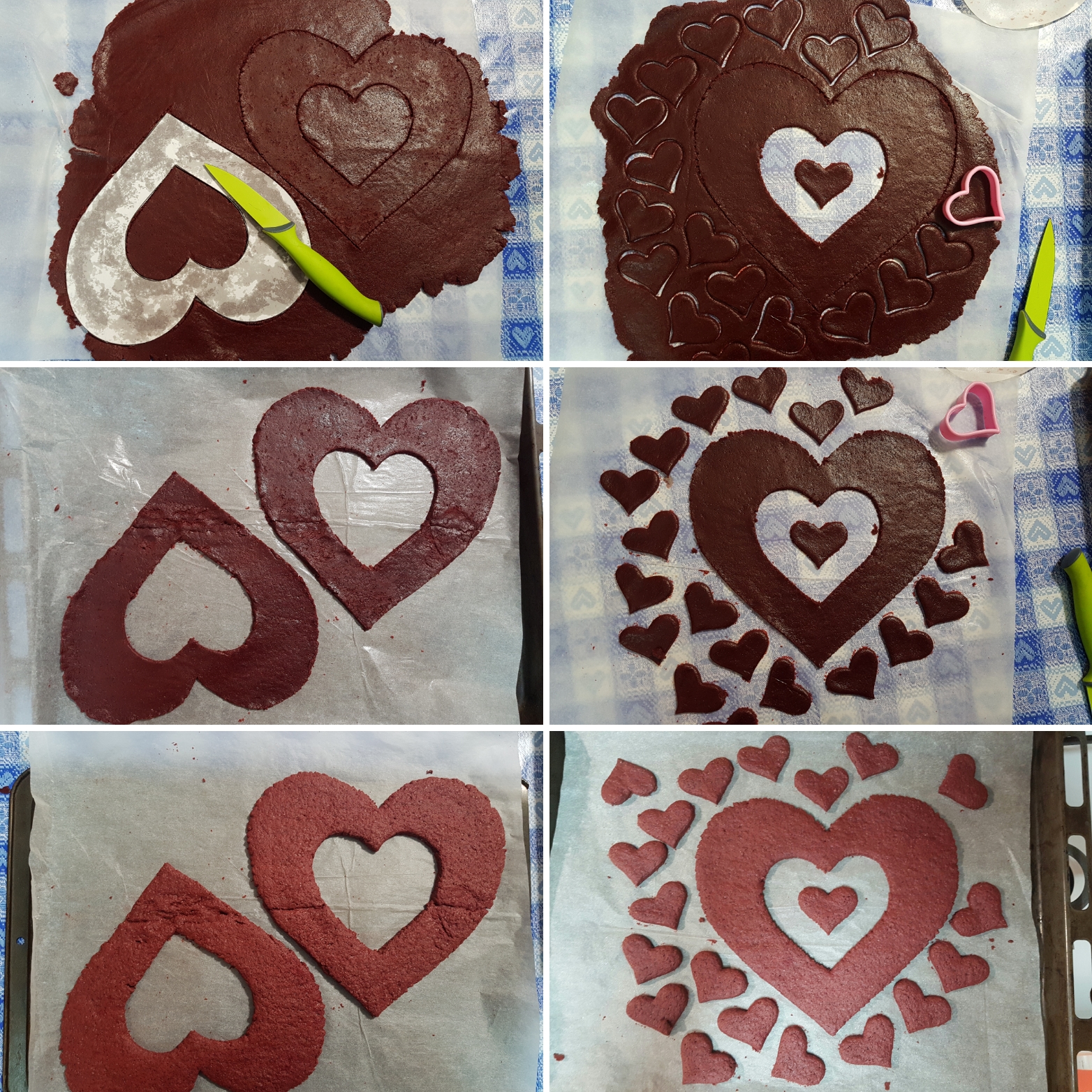 NAPOMENA: Ovom prilikom odbrala sam oblik srca i izrezala četiri osnove. Od ostataka sam odgovarajućom modlom izvadila manja srca, koja sam iskoristila manjim delom za dekoraciju, a većim za degustaciju. 🙂 - Isečene oblike zajedno sa donjim papirom prenesite na pleh i pecite u rerni zagrejanoj na 180 °C desetak minuta.