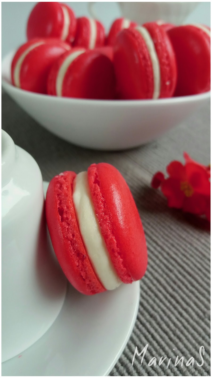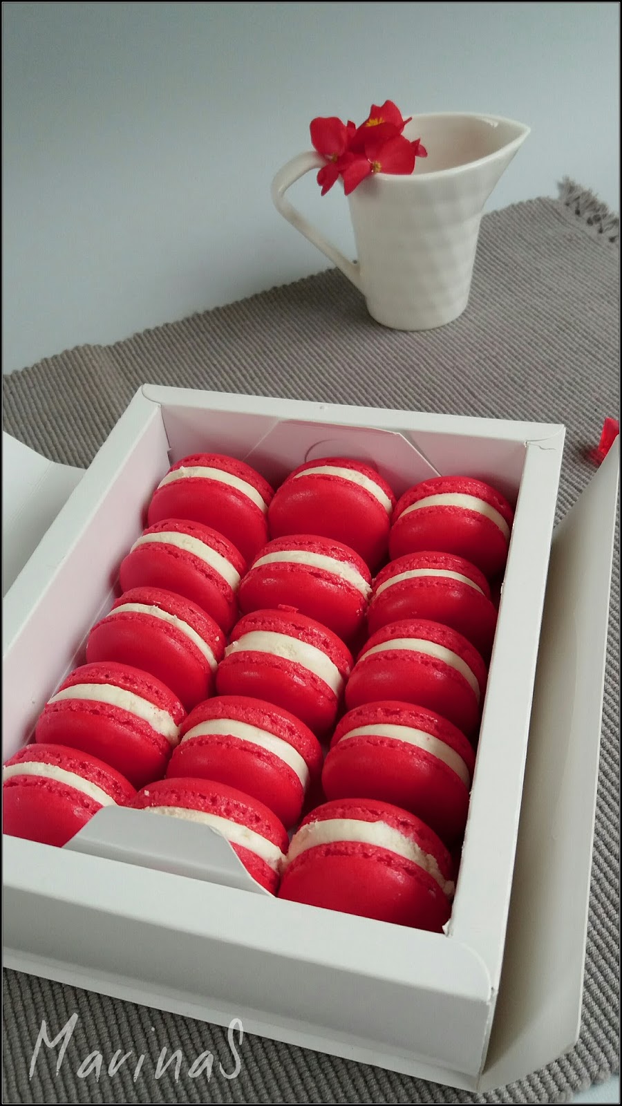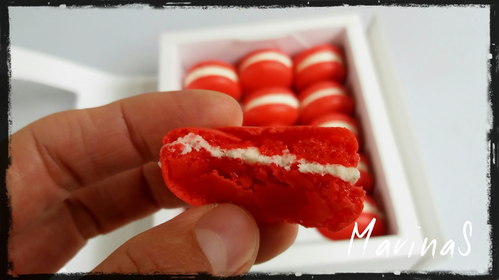 Ovog puta su to macaronsi koji izgledom podsećaju na čuveni Red Velvet Cake, intenzivno crveni spojeni belom ganaš kremom. Recept koji sledi je apsolutno proveren i dobar ako se uputstvo pažljivo prati do kraja i kad ga jednom usavršite moći ćete da se igrate bojama i kombinacijama po želji.