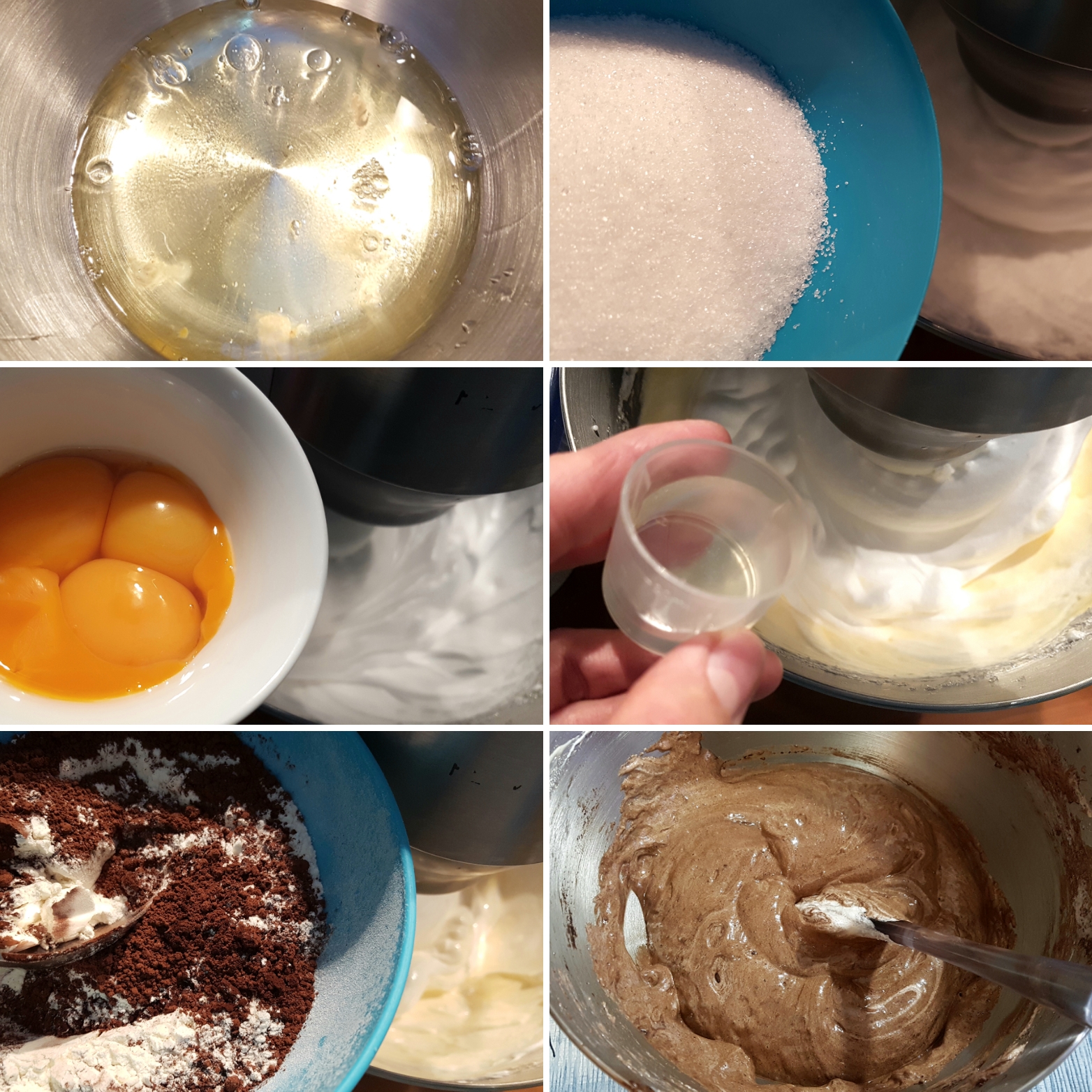 - Smanjite brzinu miksera i dodajte potom žumanca, ulje i na kraju brašno pomešano sa kakaom i praškom za pecivo, te sve umutite.