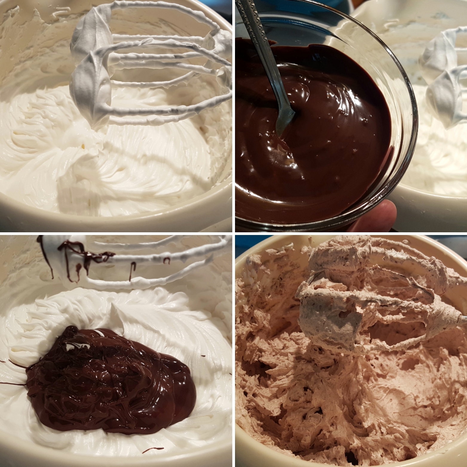 SAVET: Nemojte predugo miksati, prekinite čim se pokažu tragovi mutilica u šlagu. - Lagano sipajte ohlađenu čokoladu sve vreme muteći da se lepo sjedini.