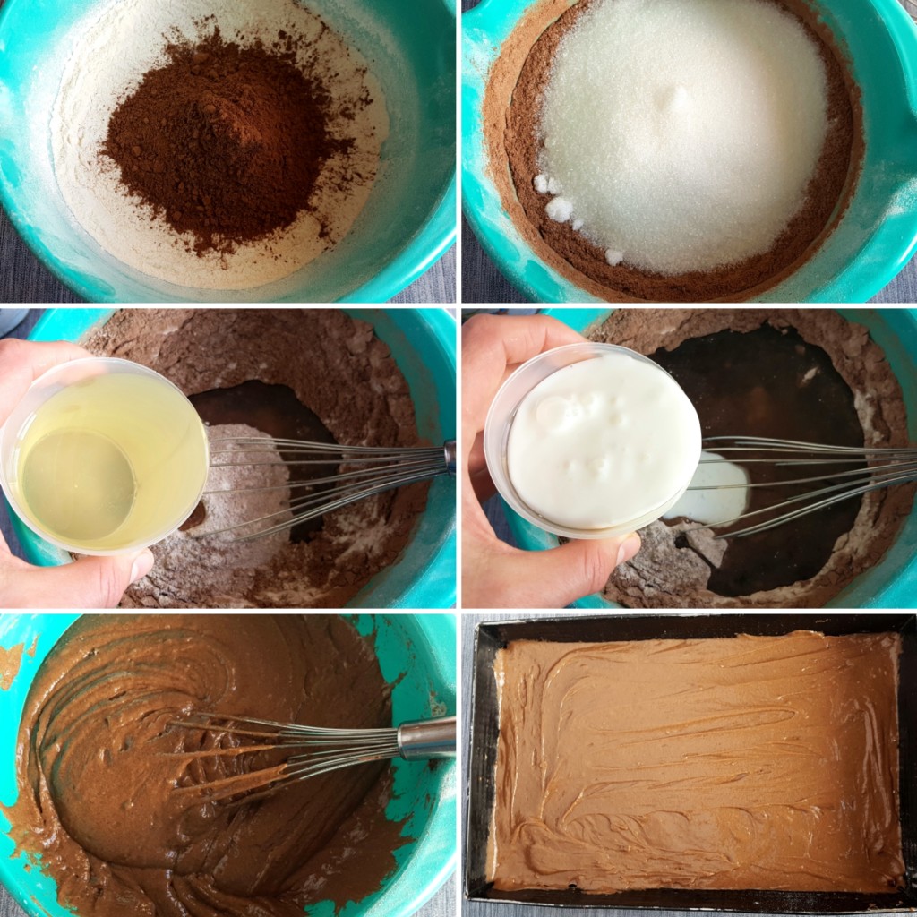 1. Pomešajte brašno sa praškom za pecivo, kakaom i šećerom, dodajte ulje i jogurt , pa izmešajte žicom da se sve lepo sjedini.