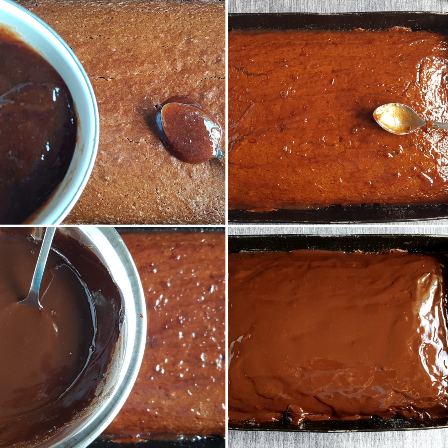 4. U sudu na pari rastopite prvo komadiće margarina, pa sklonite s vatre i dodajte kockice čokolade. Mešajte dok se ne rastopi , te prelijte od gore. Kad se glazura stegne isecite kolač na kocke željenih dimenzija.