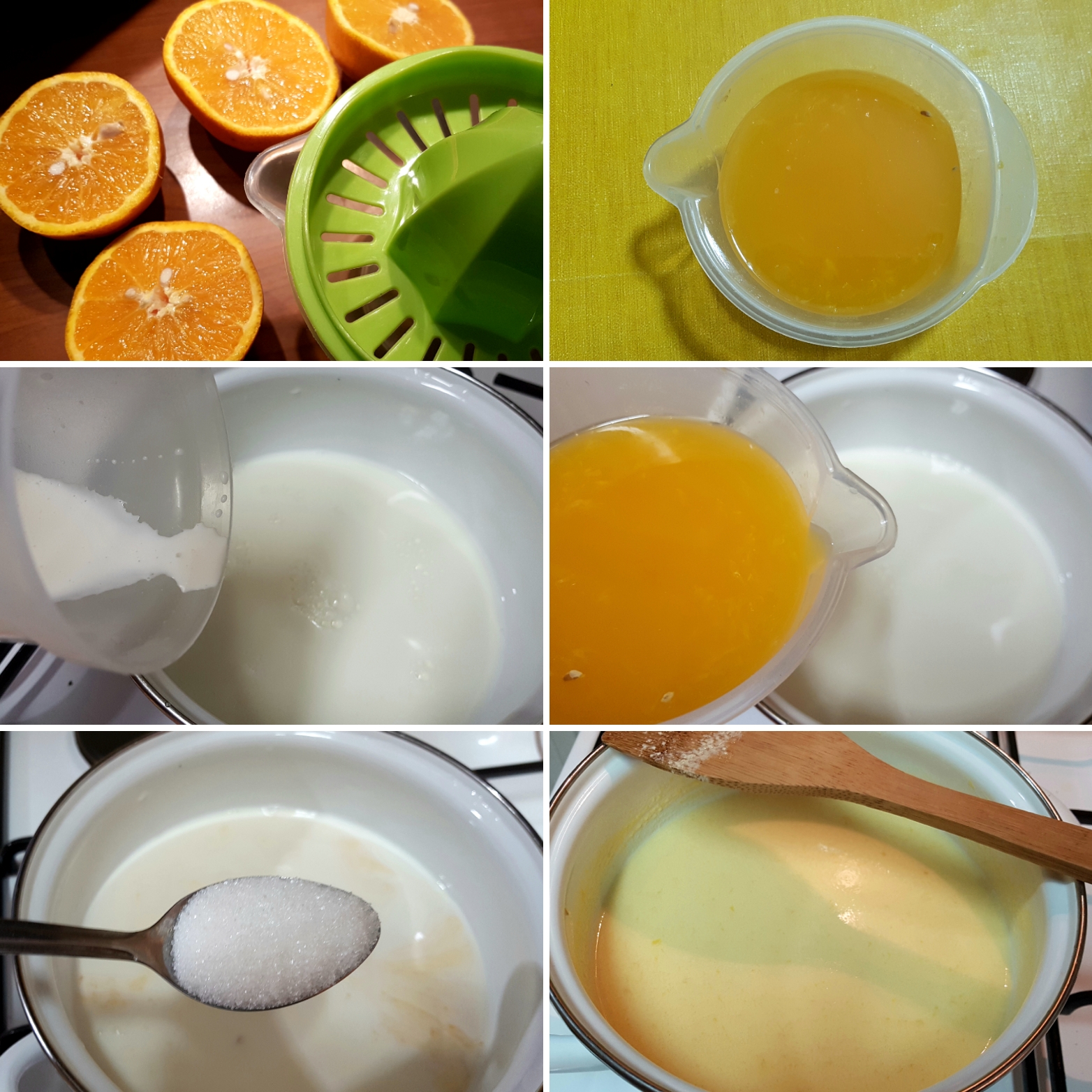 1. Iscedite narandže, pa izmerite 2 dl soka i pomešajte ga sa mlekom, slatkom pavlakom, prstohvatom soli i dve kašike šećera.