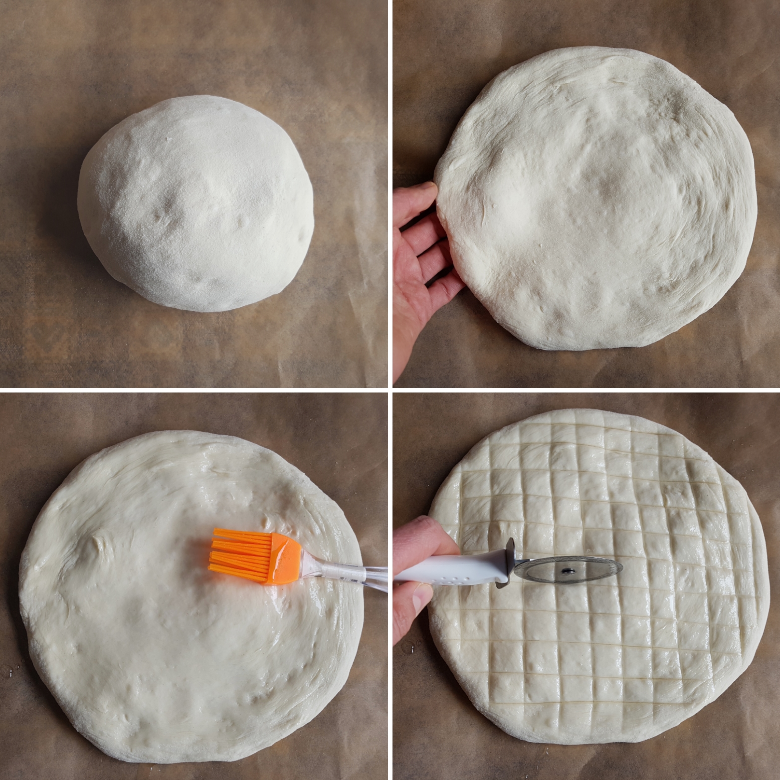 - Premažite površinu uljem, a potom je išpartajte unakrst nožem il pizza sekačem. Pospite je solju po želji.