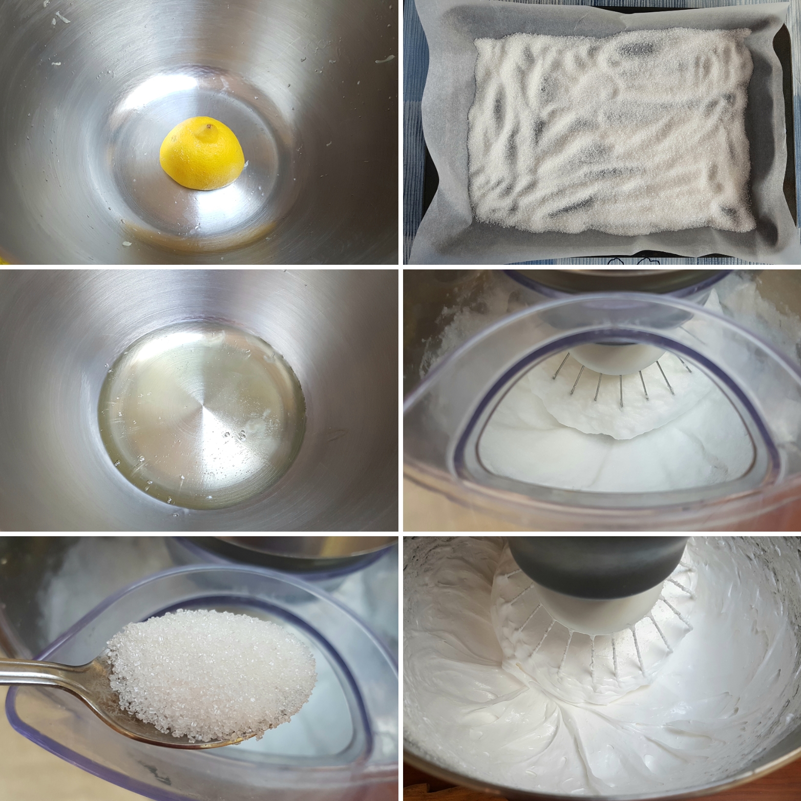 - Potom izvadite šećer iz rerne, smanjite temperaturu rerne na 100 °C, pa dodajte kašičicu po kašičicu zagrejanog šećera u šam muteći bez prekida dok ne potrošite pripremljenu količinu.