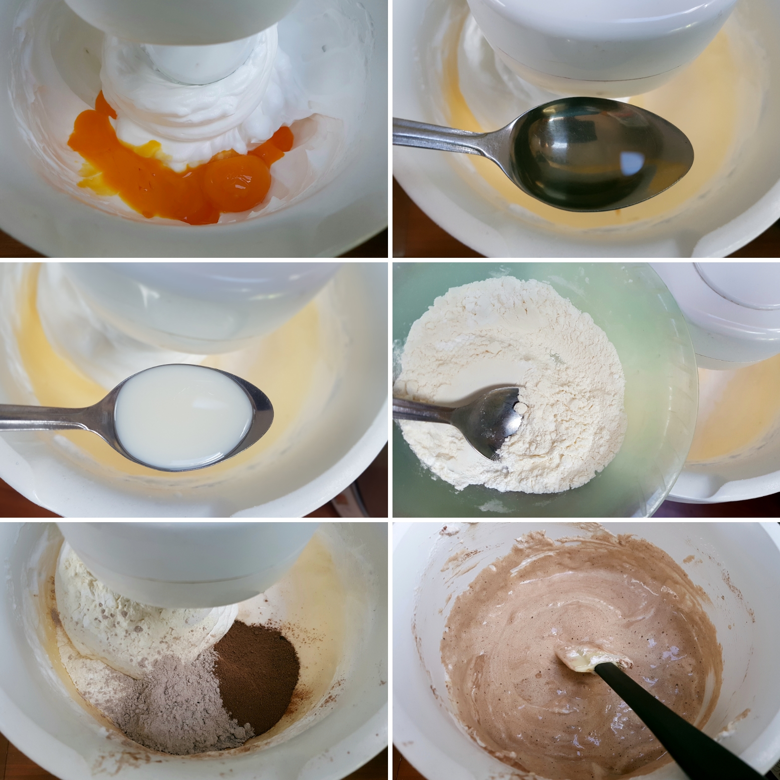 - Ulupajte 3 belanca u čvrst šam, dodajte 6 kašika šećera i još mutite. Potom dodajte redom 3 žumanca, 3 kašike ulja, 5 kašika mleka, 3 kašike brašna pomešanog sa pola praška za pecivo, 1 prašak za puding od čokolade i 1 kašiku čokoladu u prahu. Miksajte najmanjom brzinom.