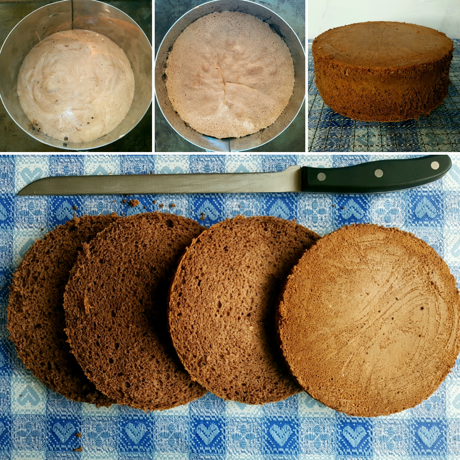 - Ohlađene biskvite horizontalno presecite tako da na kraju imate ukupno 4 tanje kore.