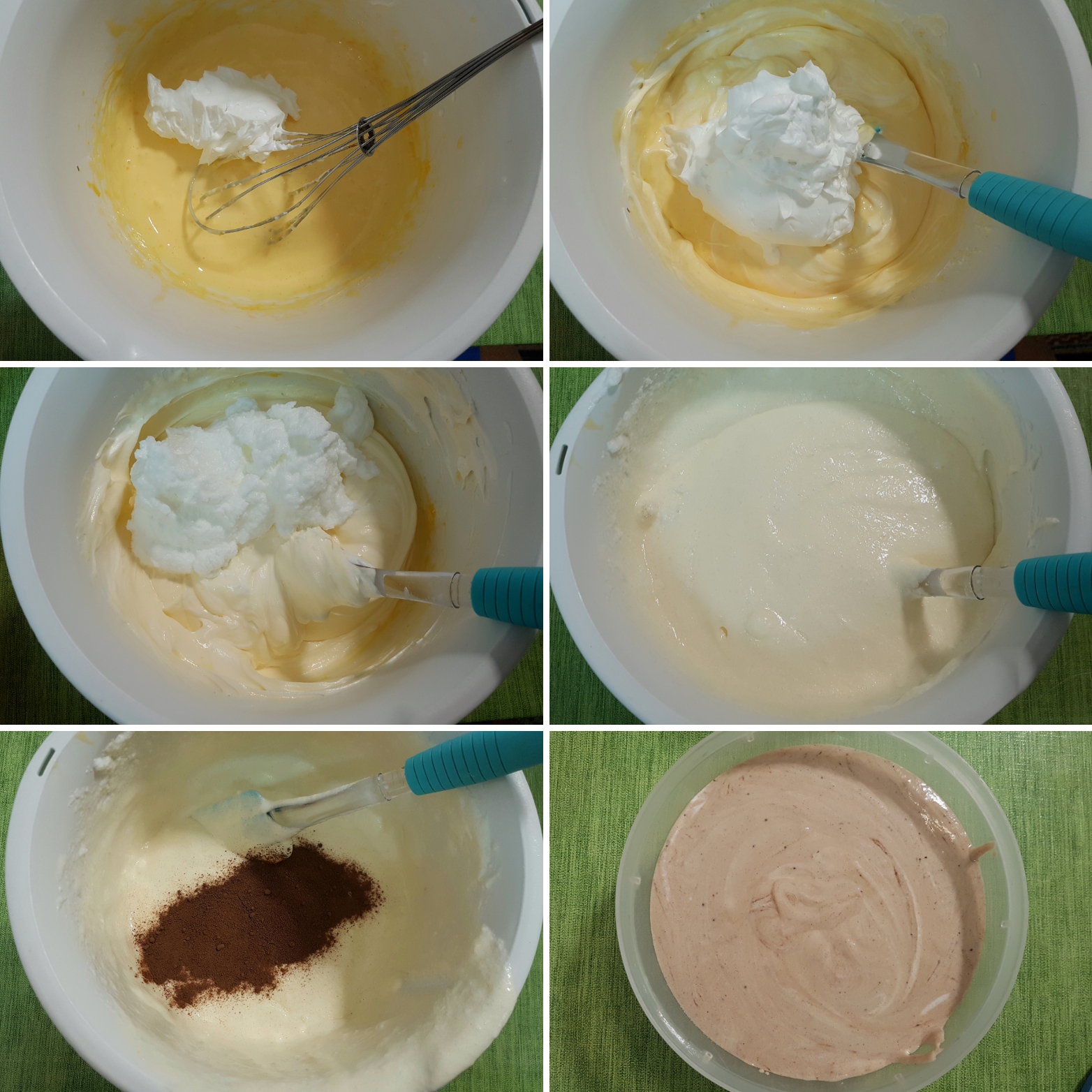 4. Kiselu pavlaku dodajte u ohlađena žumanca i lagano izmešajte da se sjedine, zatim umešajte kašiku po kašiku šlaga, a na kraju postepeno dodajte i šam od belanaca.