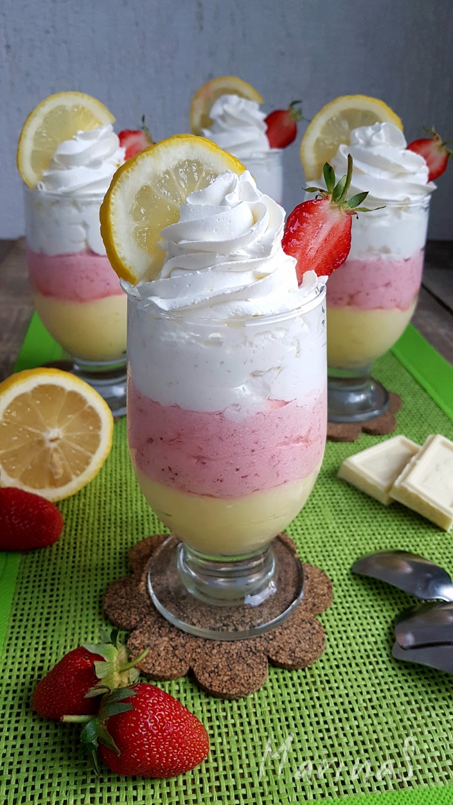 5. U čiste čaše rasporedite prvo krem od limuna, pa krem od jagoda i na kraju polovinu krema od bele čokolade.