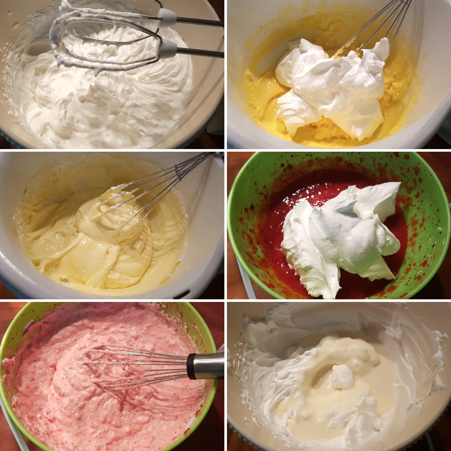 4. Preostalu slatku pavlaku ulupajte u šlag, pa trećinu umešajte u pire od jagoda. Drugu trećinu dodajte kremi od limuna i lagano ih sastavite. U ostatak umućene pavlake dodajte belu čokoladu prethodno rastopljenu u pavlaci i zajedno izmiksajte.
