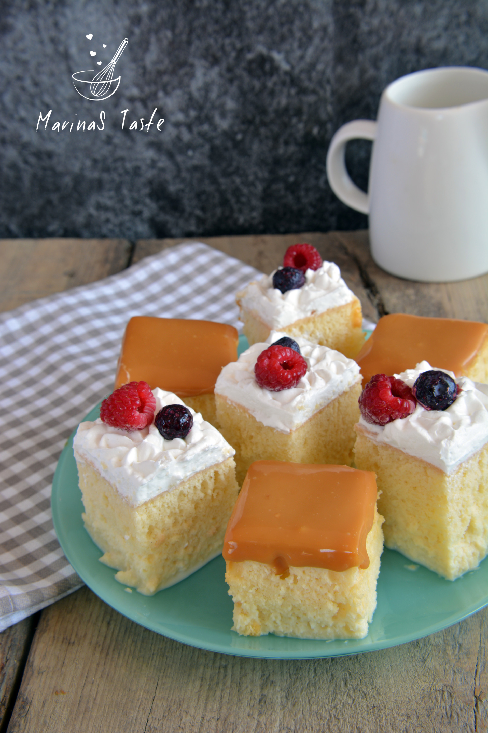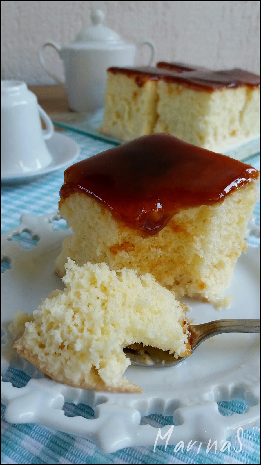 - Kad se dobro rashladi i upije mlečni preliv premažite ga karamel sosom il šlagom, secite na kocke i služite.