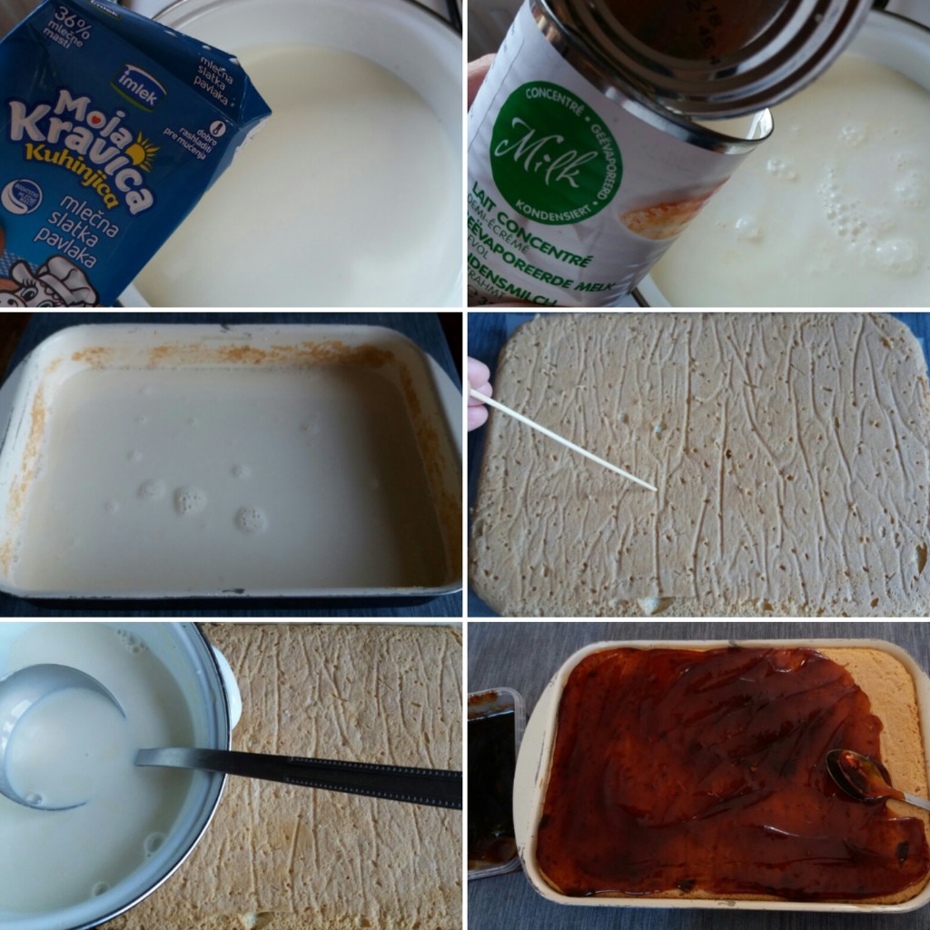 SAVET: Postoji mogućnost i da vruć biskvit prelijete hladnom mešavinom mleka, slatke pavlake i kondenzovanog mleka što je mnogo jednostavnija verzija, već više puta isprobana.