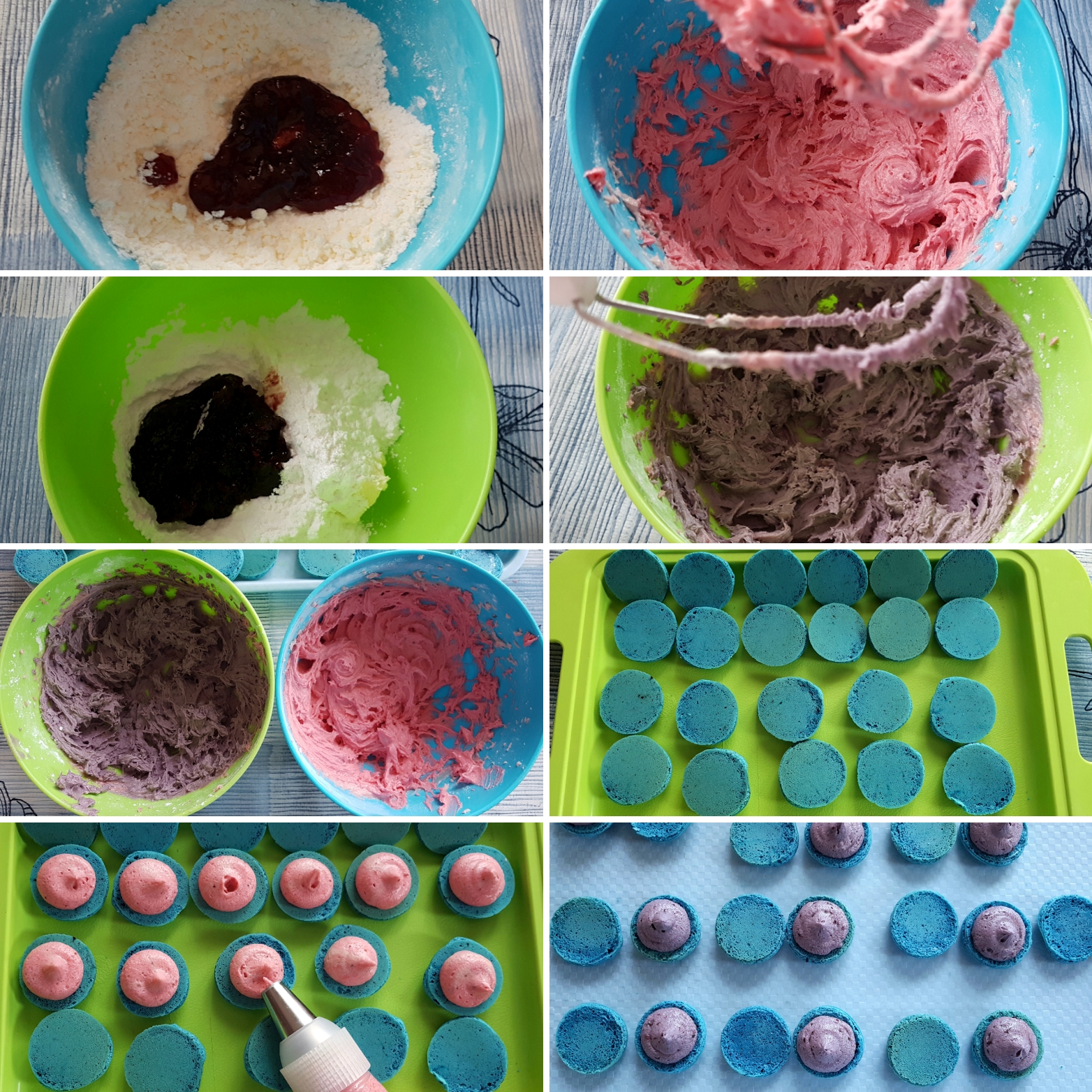 NAPOMENA: Ovog puta sam pravila sa džemovima od malina i od kupina. Nisam ih propasirala jer su već bili bez semenkica, inače obavezno to uradite ako želite gladak krem. - Pripremljenim kremom spajajte po dva macaronsa i odložite ih u plastične kutije s poklopcem. Čuvajte ih u frižideru do sedam dana.