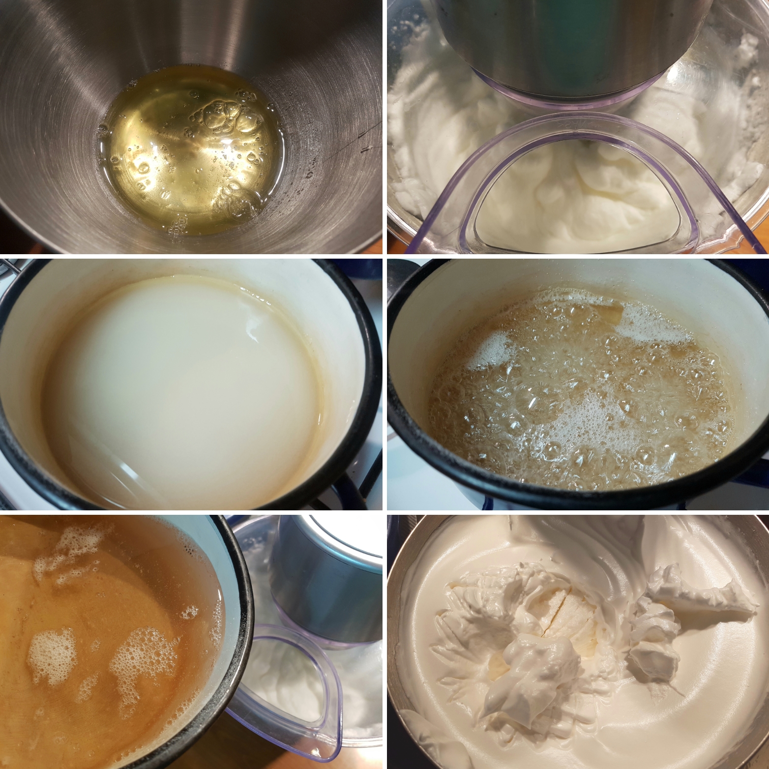 SAVET: Znaćete da je dovoljno kad primetite da se počne zgušnjavati. - Vreo sirup u tankom mlazu sipajte u šam ne prekidajući mućenje. Nakon dodavanja cele količine miksajte još desetak minuta dok se masa ne ohladi.